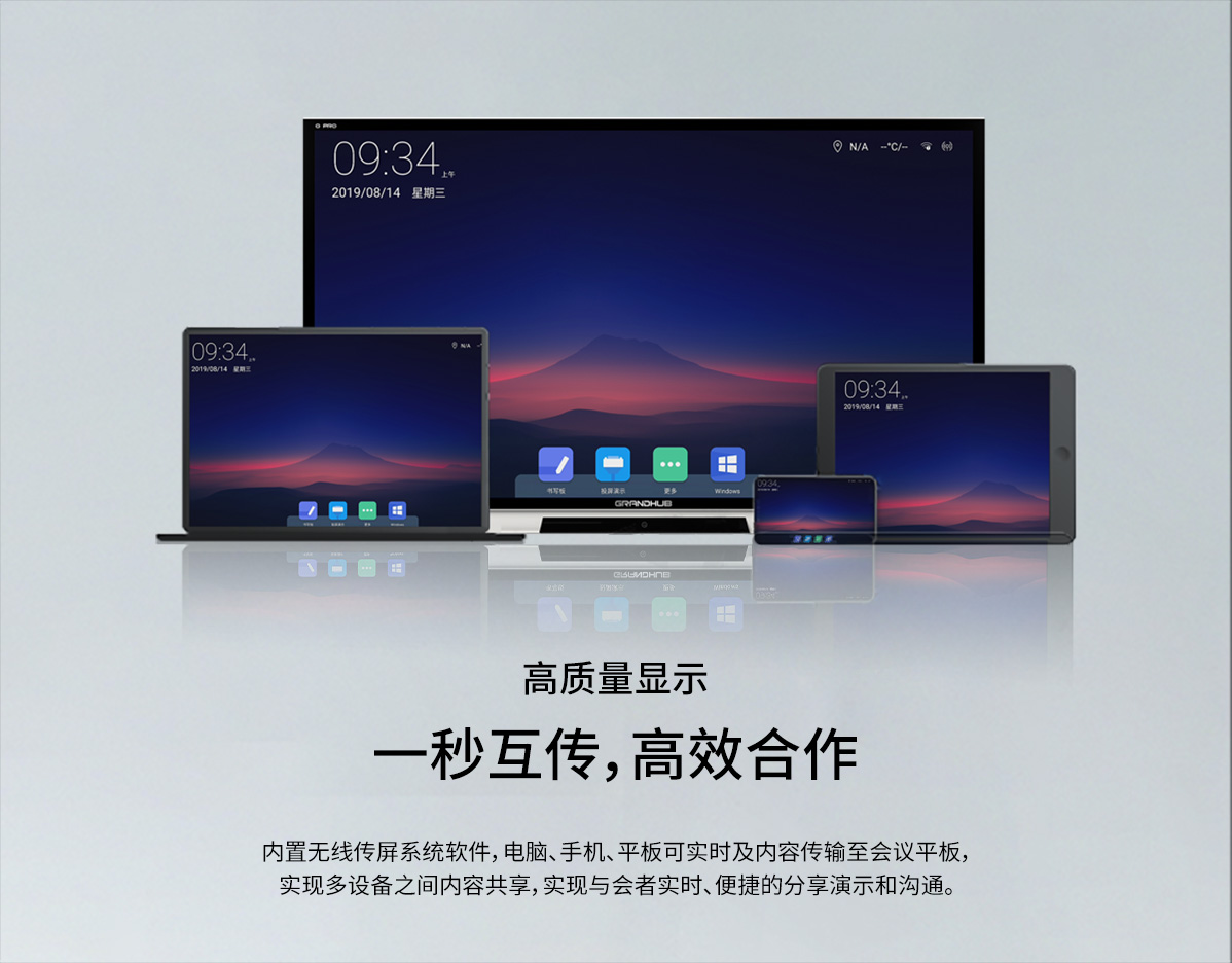 内置无线传屏系统软件,电脑、手机、平板可实时及内容传输至会议平板, 实现多设备之间内容共享,实现与会者实时、便捷的分享演示和沟